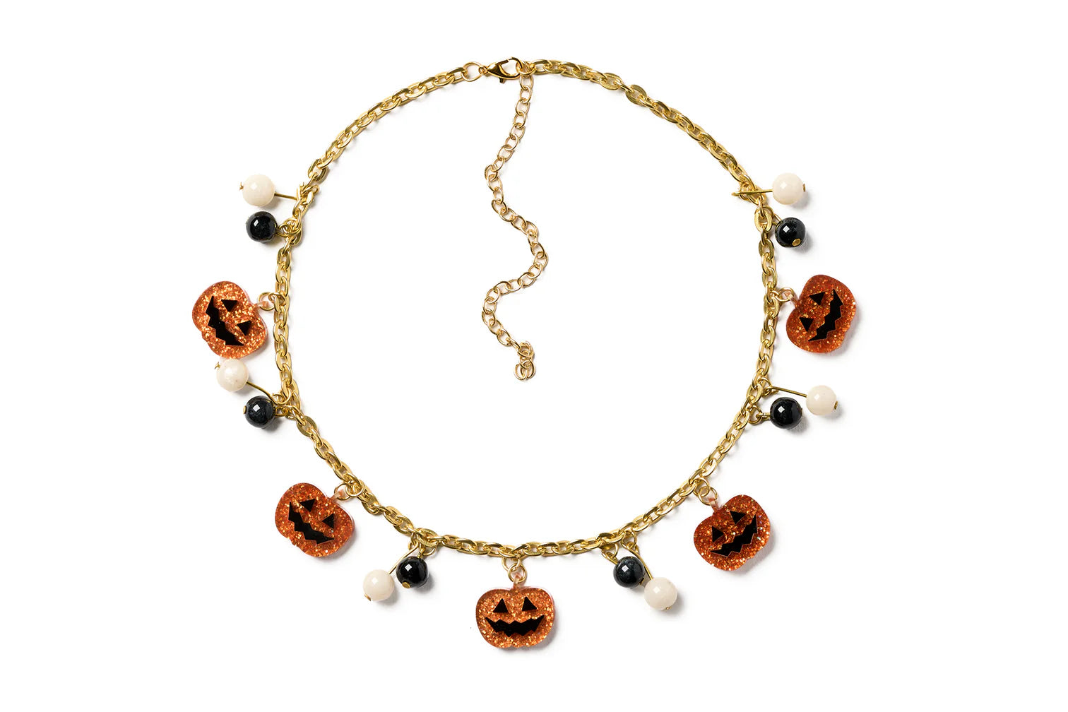 The Gourdgeous Necklace brings the jack-o-lantern spirit front and centre. Black and white resin beads sparkle with sheen and glitter pumpkin-inspired drops make for a statement piece that screams Halloween chic.